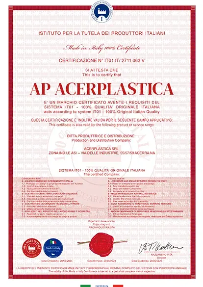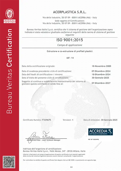 Da pioniere, Acerplastica ha realizzato il proprio Sistema Controllo Qualità interno, stilando procedure chiare, semplici ed efficaci per fornire prodotti altamente performanti ai propri clienti. E’ con orgoglio che da anni la visita ispettiva di mantenimento viene superata con zero non conformità, in un percorso verso il costante miglioramento.